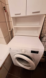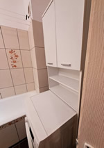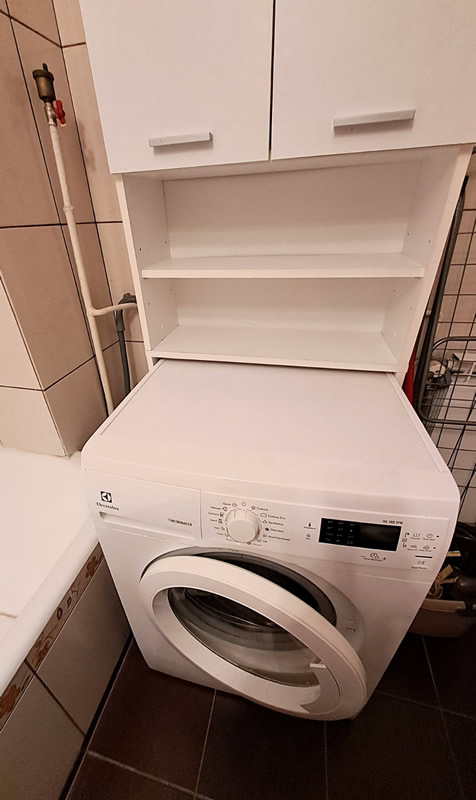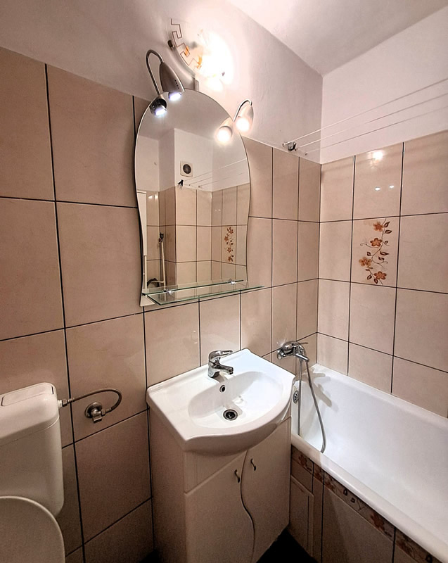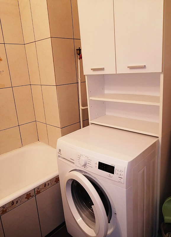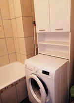 - Tágas fürdőszoba káddal, kényelmes hely a mosógép számára;